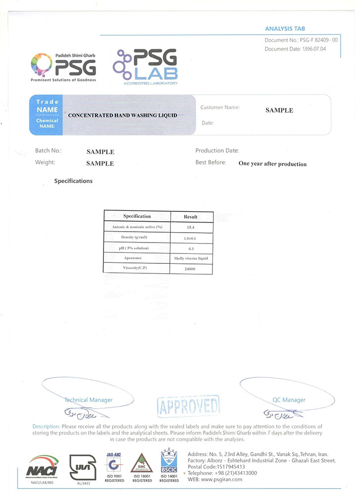 کنستانتره مایع دستشویی ترکیبی از سورفکتانت های آنیونیک، آمفوتریک، نانیونیک و مواد نرم کننده پوست دست می باشد.